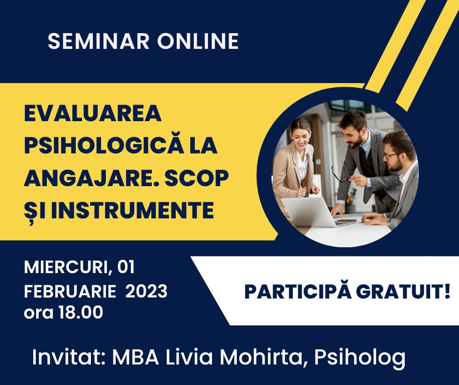 Vă invităm să descoperiți alături de noi ce presupune Evaluarea psihologică realizată la angajare dar și care sunt scopul si instrumentele utilizate. În cadrul evenimentului o vom avea invitată pe Livia Mohirță, Psiholog și trainer de optimizare și dezvoltare organizațională. Seminarul este gratuit, are loc în cadrul Proiectului De la Student la Antreprenor, și va fi organizat miercuri, 01 februarie 2023, începând cu ora 18.00. Înscrierile la seminar se fac online, completând formularul disponibil la următorul link.