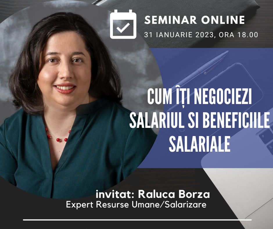 Vă invităm să descoperiți Cum să vă negociați salariul și pachetul de beneficii salariale de la Raluca Borza, Manager de HR cu o vastă experiență în domeniu. Seminarul este gratuit, are loc în cadrul Proiectului De la Student la Antreprenor, și va fi organizat marti, 31 ianuarie 2023, începând cu ora 18.00. Înscrierile la seminar se fac online, completând formularul disponibil la următorul link.
