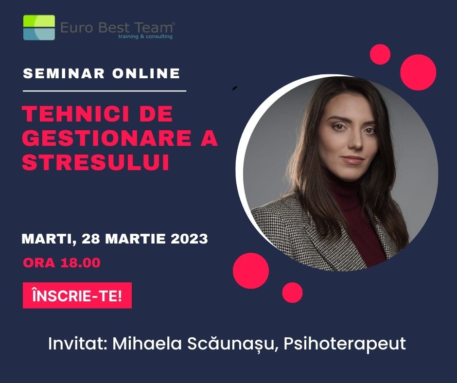 Seminarul care o va avea ca invitată pe Mihaela Scăunașu, psihoterapeut, își propune să prezinte câteva soluții pe care știința ni le oferă în prezent. În funcție de situațiile cu care ne confruntăm, le putem pune în practică pentru a fi mai eficienți și pentru o mai bună calitate a vieții.